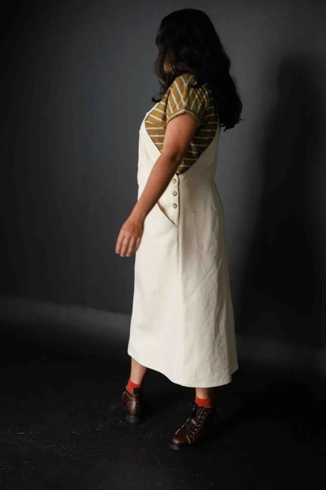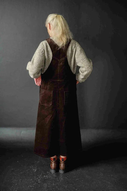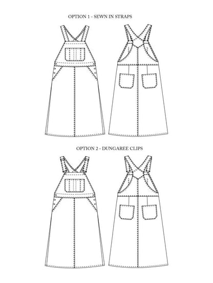 A hard working pinafore dress, featuring classic detailing and topstitching. Choose to make it with dungaree clips or sewn in straps.