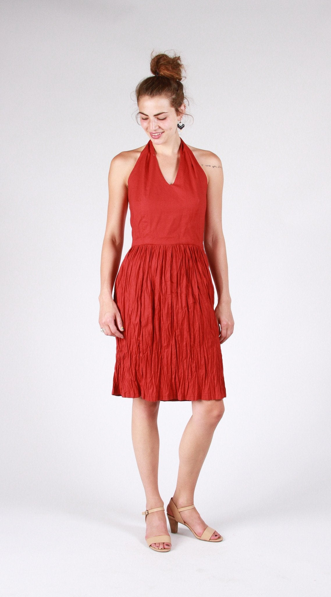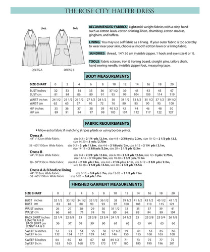 The Rose City Halter is a classic and timeless dress that is sure tol be wardrobe worthy for years to come. It features a lined, fitted bodice with bust darts, a V-neckline, halter neck ties, an invisible side zipper and a hemline that falls at the knees. There are 2 skirt versions. Version A features a gathered skirt with in-seam pockets. Version B features an A-line, bias cut skirt with curved patch pockets. This is an intermediate level pattern. Sizes 0 - 20