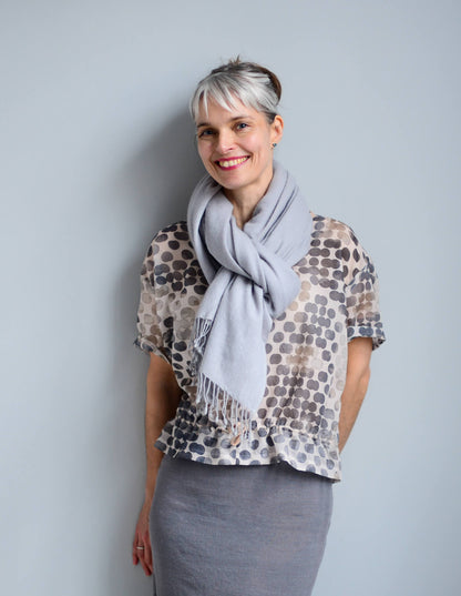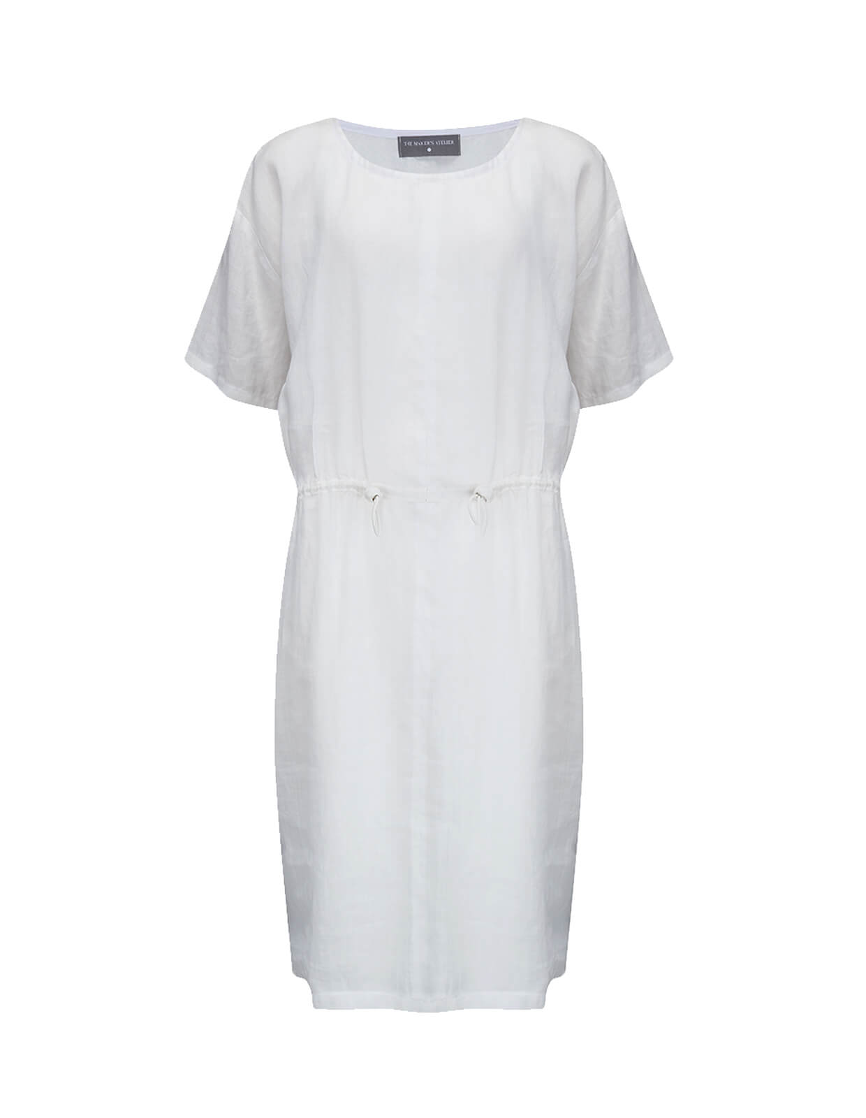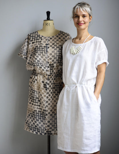 This is a loose fitting dress with the drawstring adding definition but not intended to be cinched in. The samples shown are worn by a 5'6", size 12 model wearing the size 12 dress in lightweight linen and a cotton/silk voile.