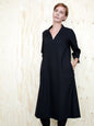 The V-neck dress has a narrow V-shaped neckline that continues as a collar in the back of the neck. It features 3/4 long sleeves, pockets in side seams and an optional belt. The pattern includes parts and instructions to make the model with or without sleeves.