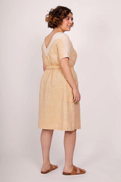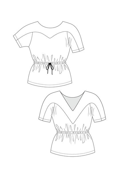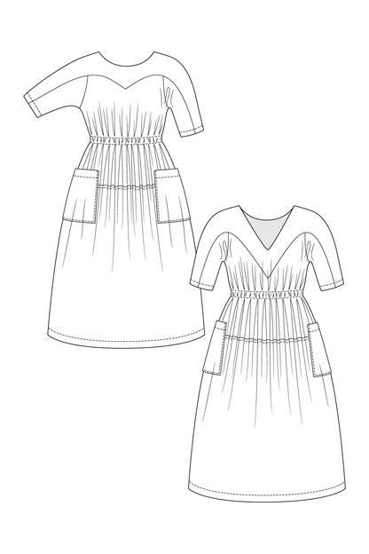 The Valo pattern includes two variations: a midi dress with an elastic waist and large patch pockets, and a relaxed-fit top with a gathered drawstring waist. Both variations have a distinctive heart-shaped yoke with a scoop neck to front and a V-neck to reverse. The dress hip seam is reinforced with a flat-felled seam, which gives it a lovely shape, and works as a subtle little detail. The dress features elegant half-sleeves whilst the top comes with perky short sleeves.