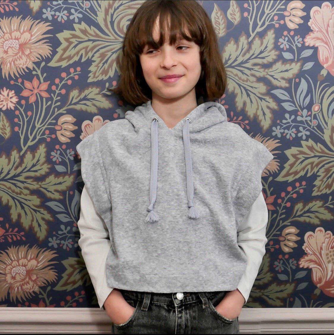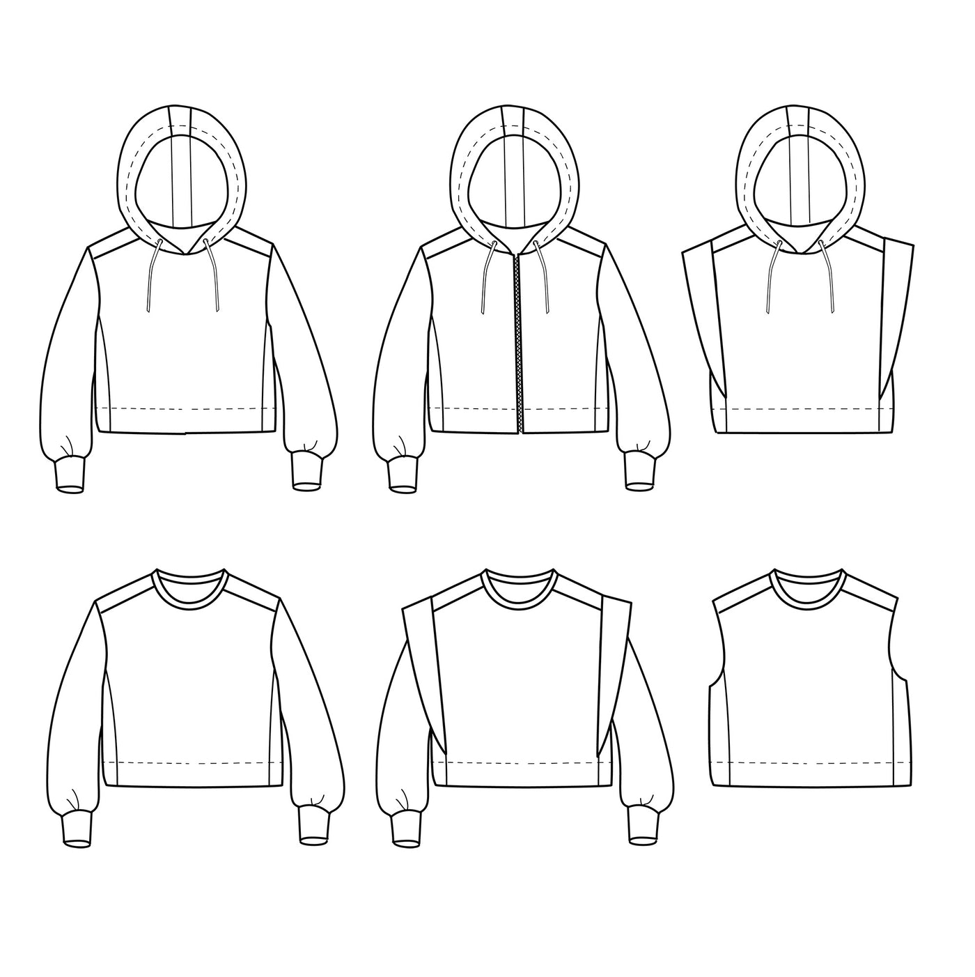 Outer: French Terry, fleece, sherpa, jersey, ribbed knits, fancy knitted fabrics such as waffle or terry . Hood lining: jersey, cotton poplin or chambray. Cuffs + neckband (hoodless version): ribbing