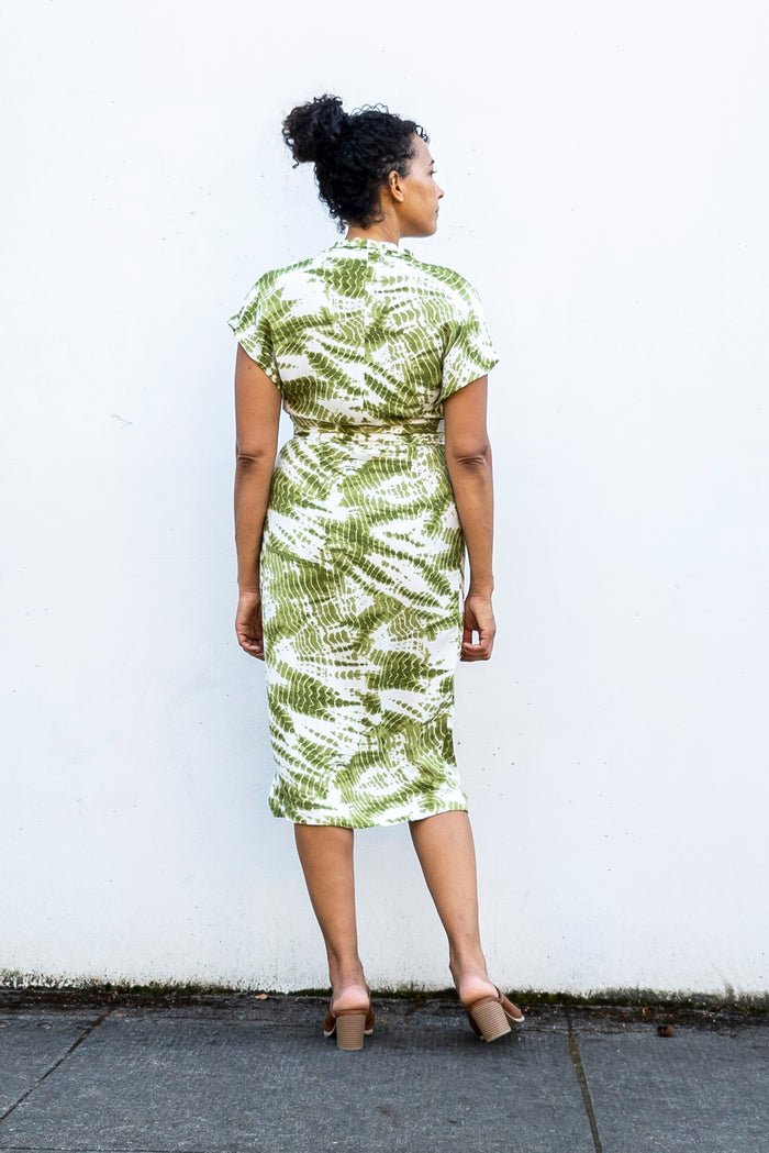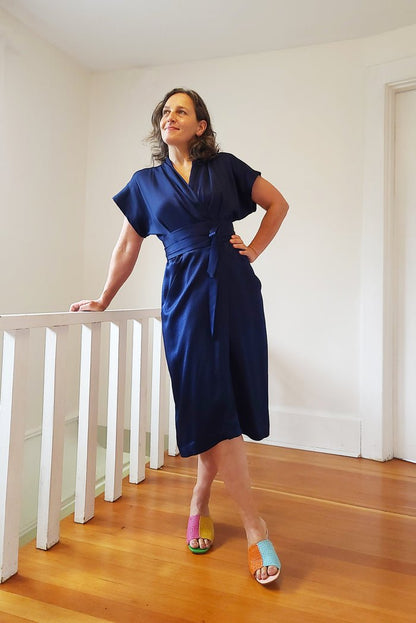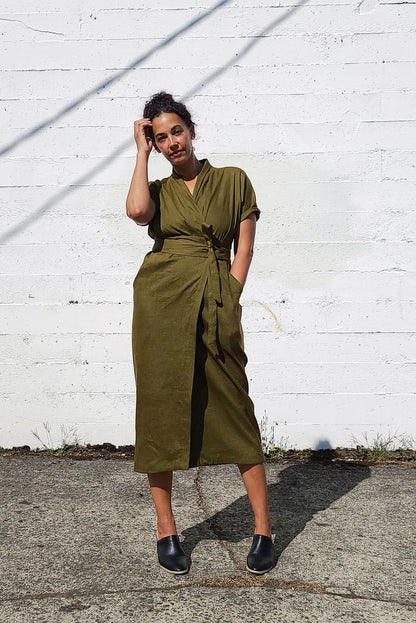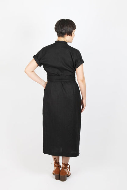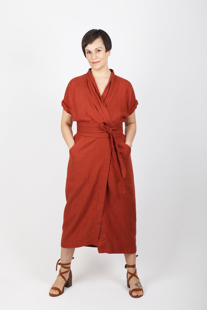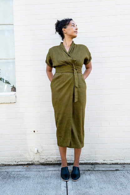 The Wildwood Wrap Dress is a shawl collar wrap dress with a detachable belt. It features waist and shoulder pleats, a slim skirt and deep pockets. Two sleeve options and two hem lengths give you several options to make your Wildwood Wrap Dress your own.